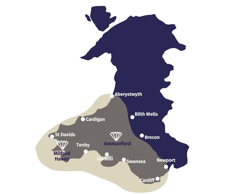 Carmarthenshire • Pembrokeshire • Neath Port Talbot • Swansea • Cardiff • Bridgend • Vale of Glamorgan • South Ceredigion (south of Aberystwyth)